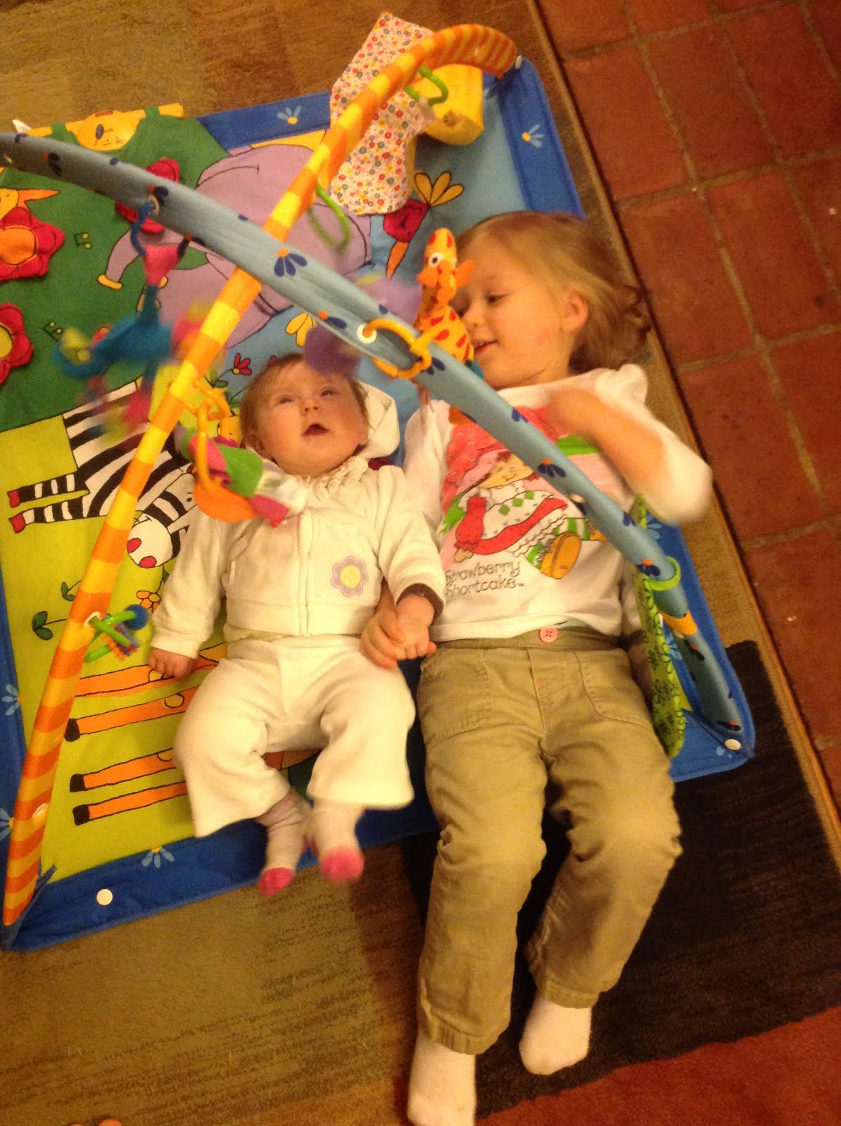 Belle rushed to "help" Emily play on the playmat. Belle is holding Emily's hand and making the giraffe rattle.